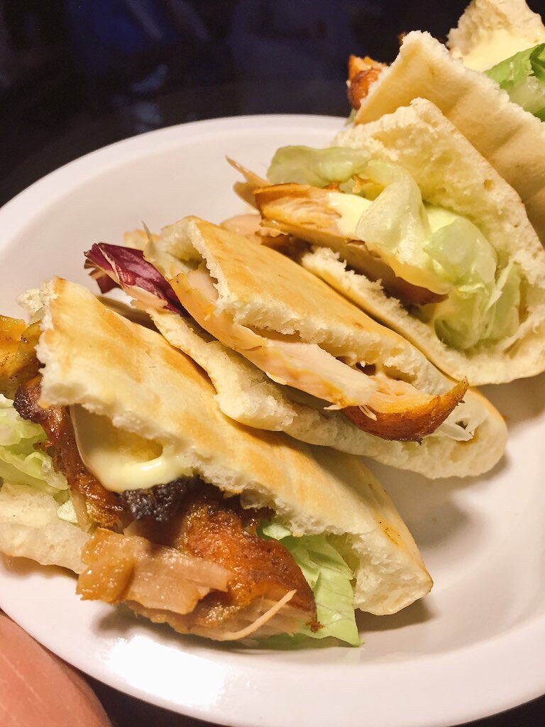 焼きあがったら、チキンをほぐして、あらかじめ温めておいたピタパンに、レタスと一緒に挟んで、マヨネーズをちょいとつければ、タンドリーチキンサンドの完成です!