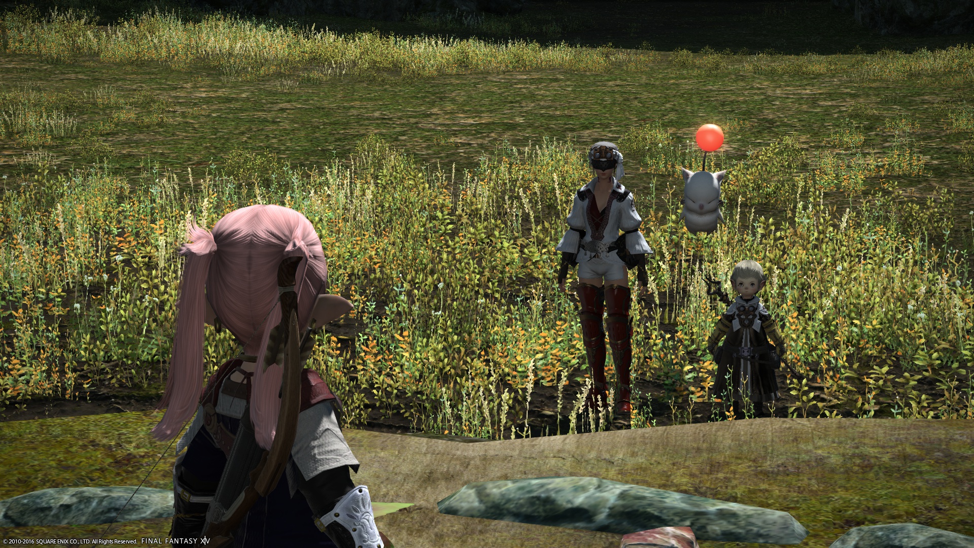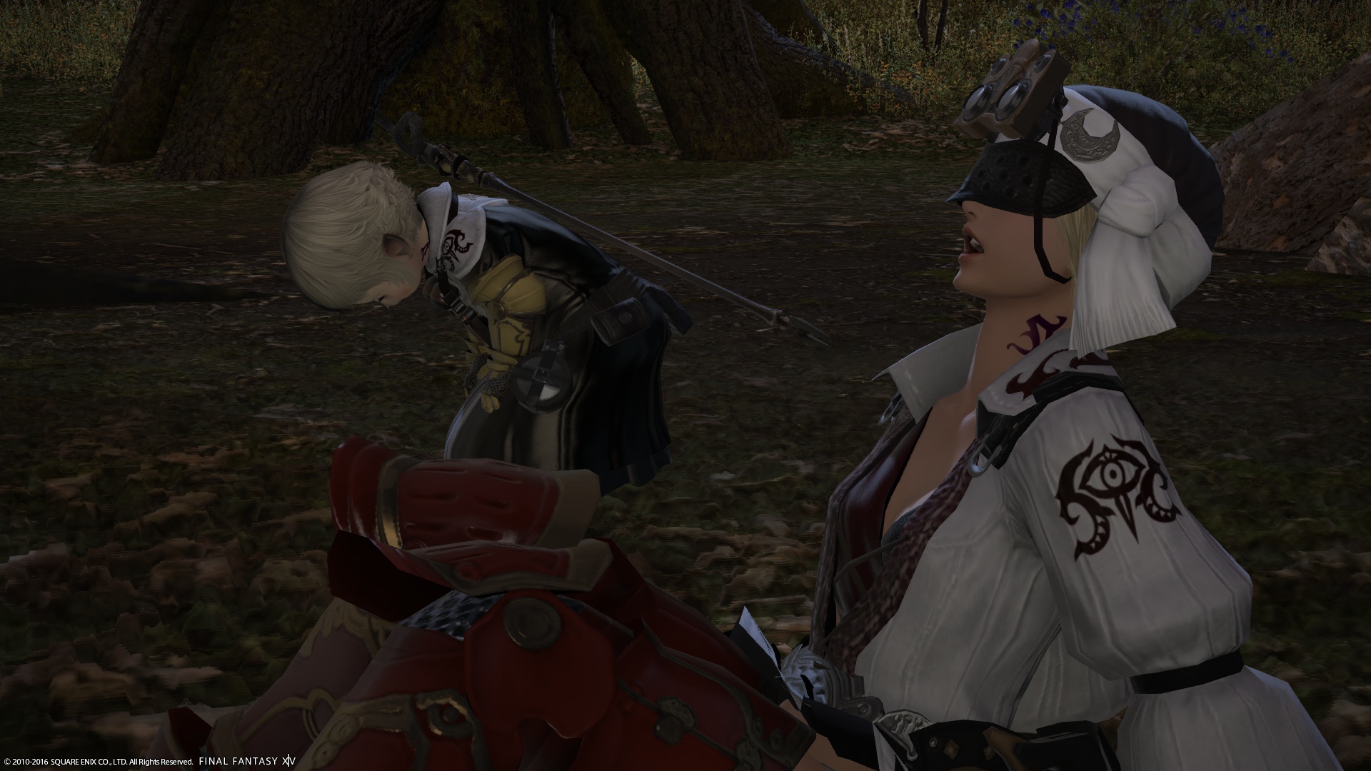 後ろを振り向いてみると、仮面の女性? と、ララフェルの男の人が立っていた。