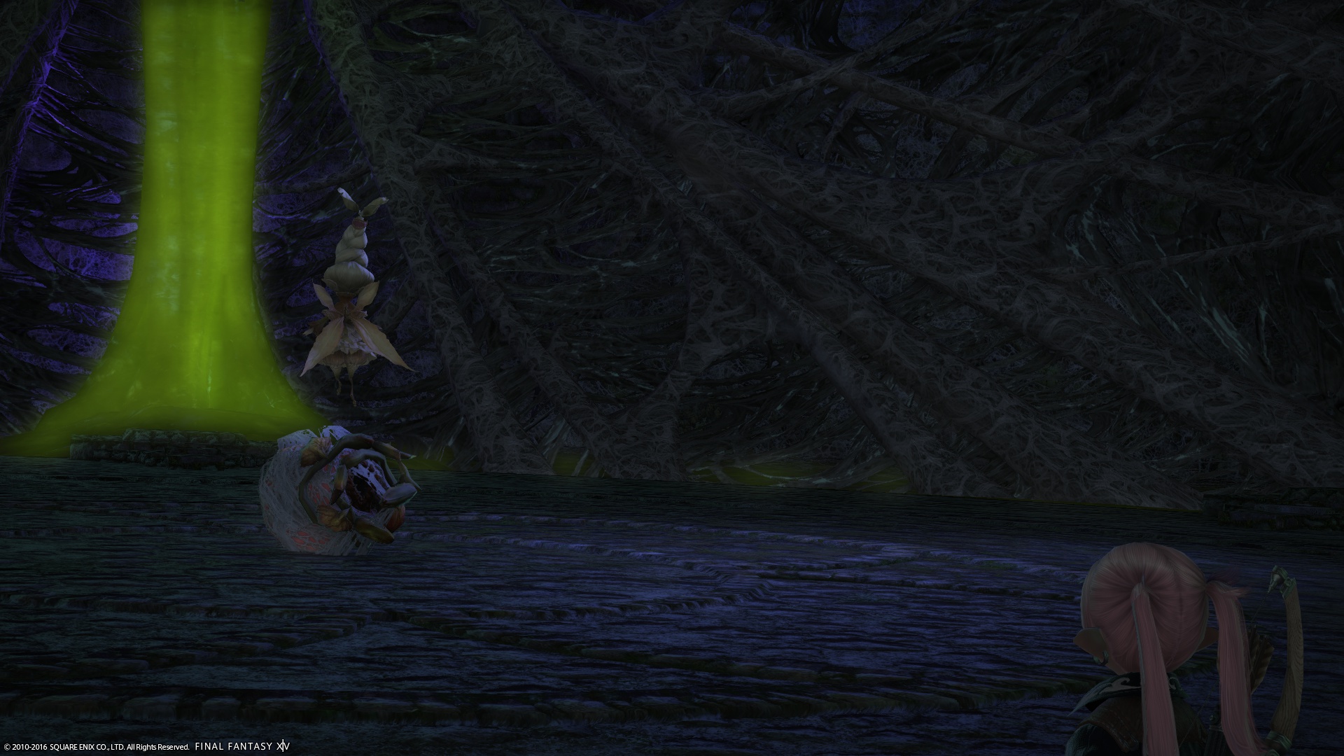 加えて、部屋のそこかしこに、粘着性の粘液や糸がまき散らされていて、足場に注意を払わざる得ない上に、コチューの繭もあって、下手に移動すると、足を取られたり爆発に巻き込まれたりする状況は、常に移動しながら戦う事を基本としている弓術士にとって、非常にやりずらい状況だった。