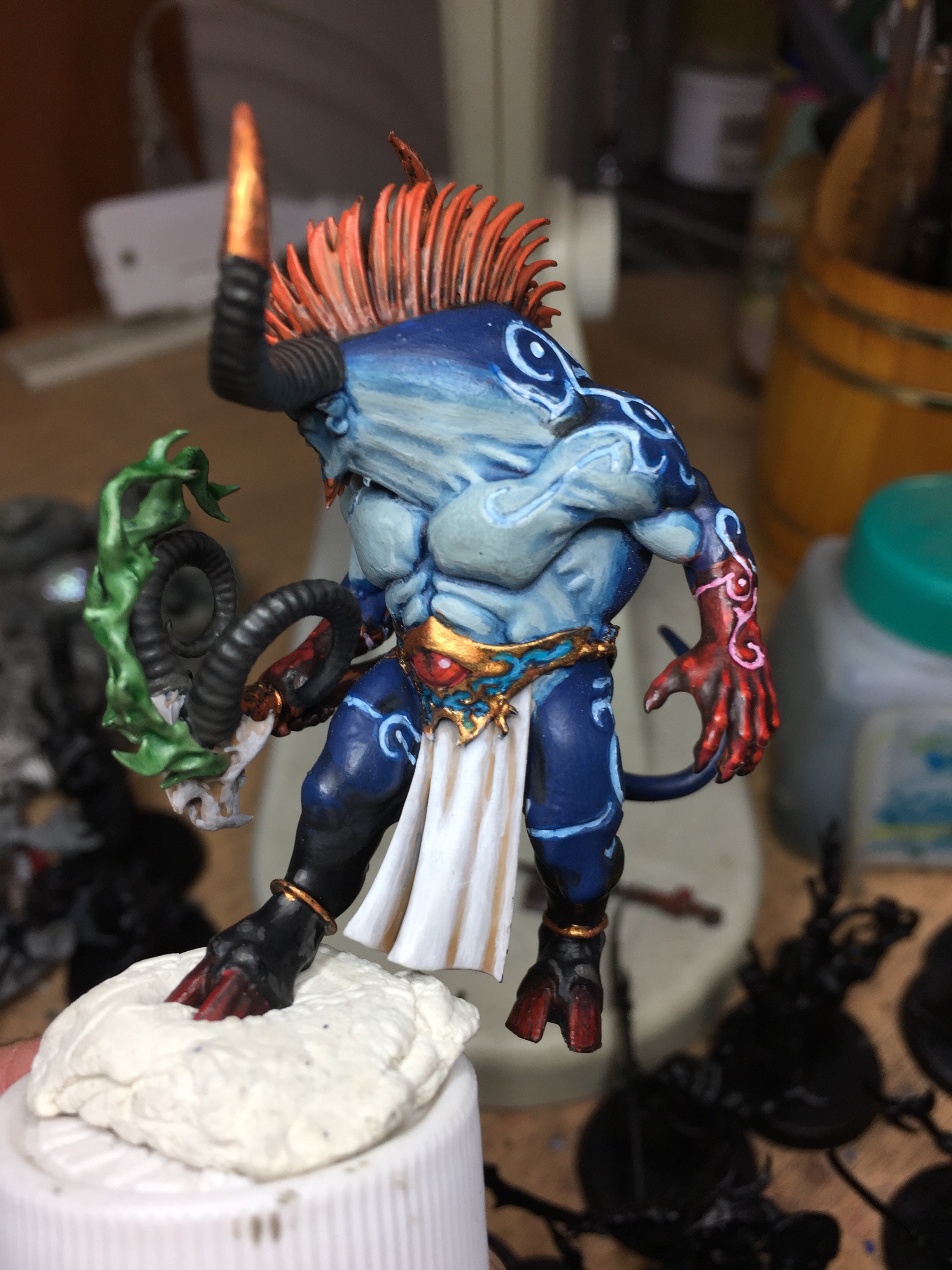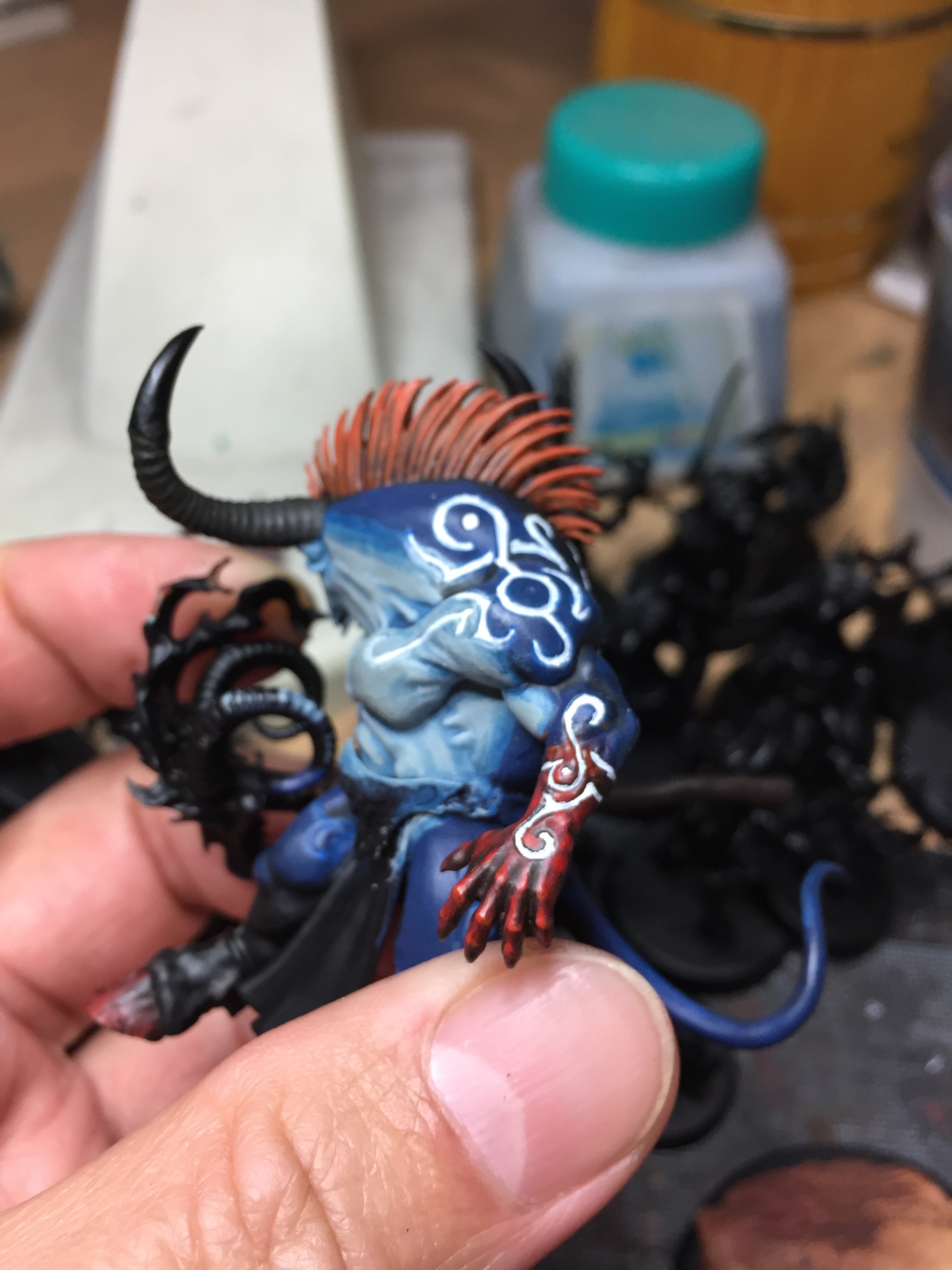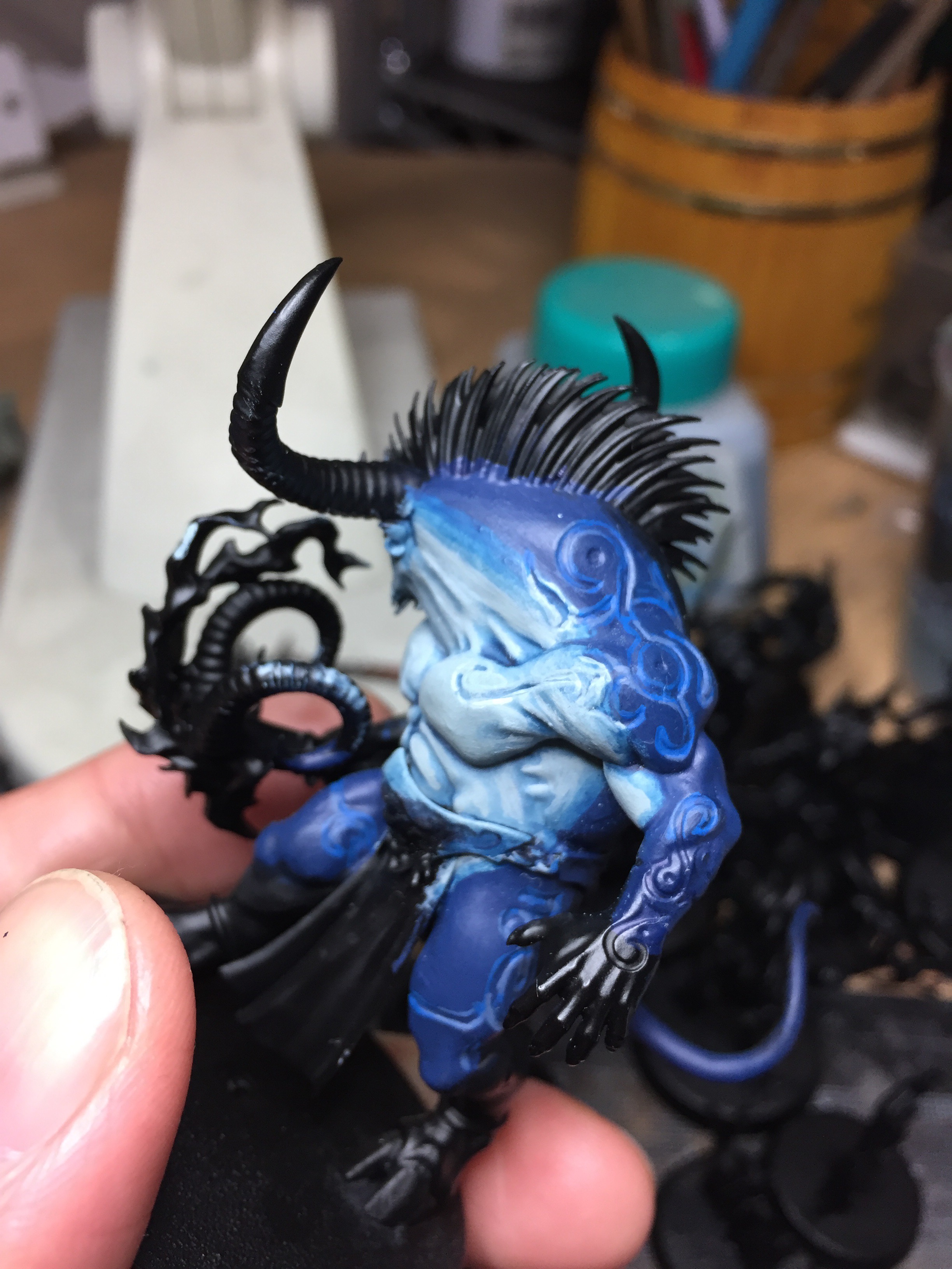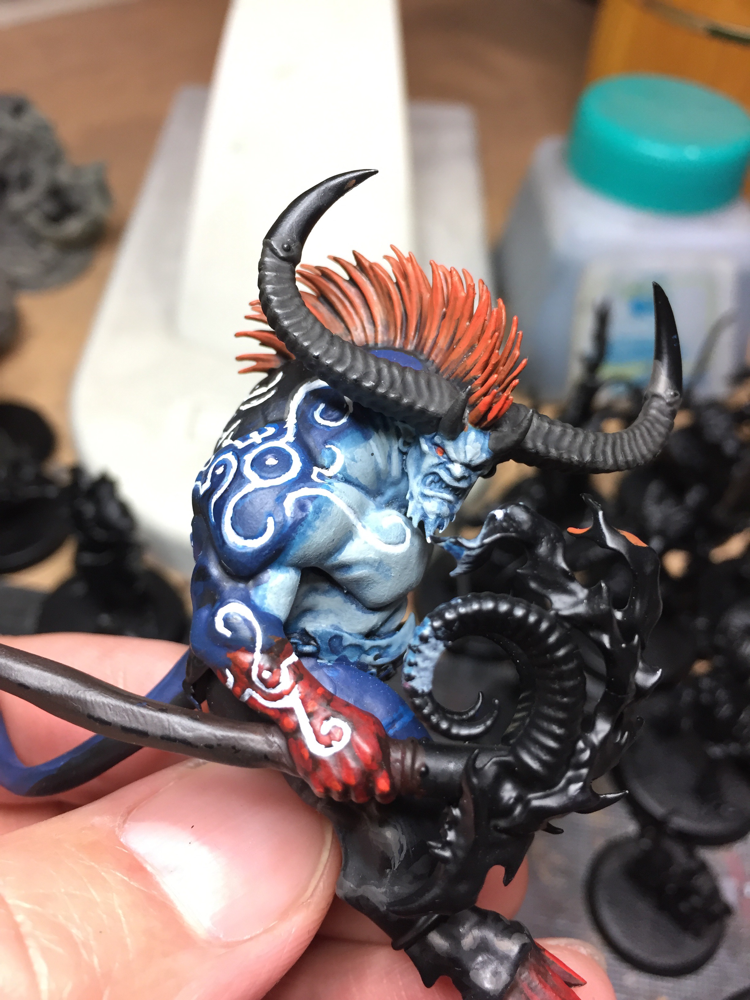 メインとなる青肌を塗り終わったら、腕や鬣などを塗り、体の紋様に色を流し込んで行きます。