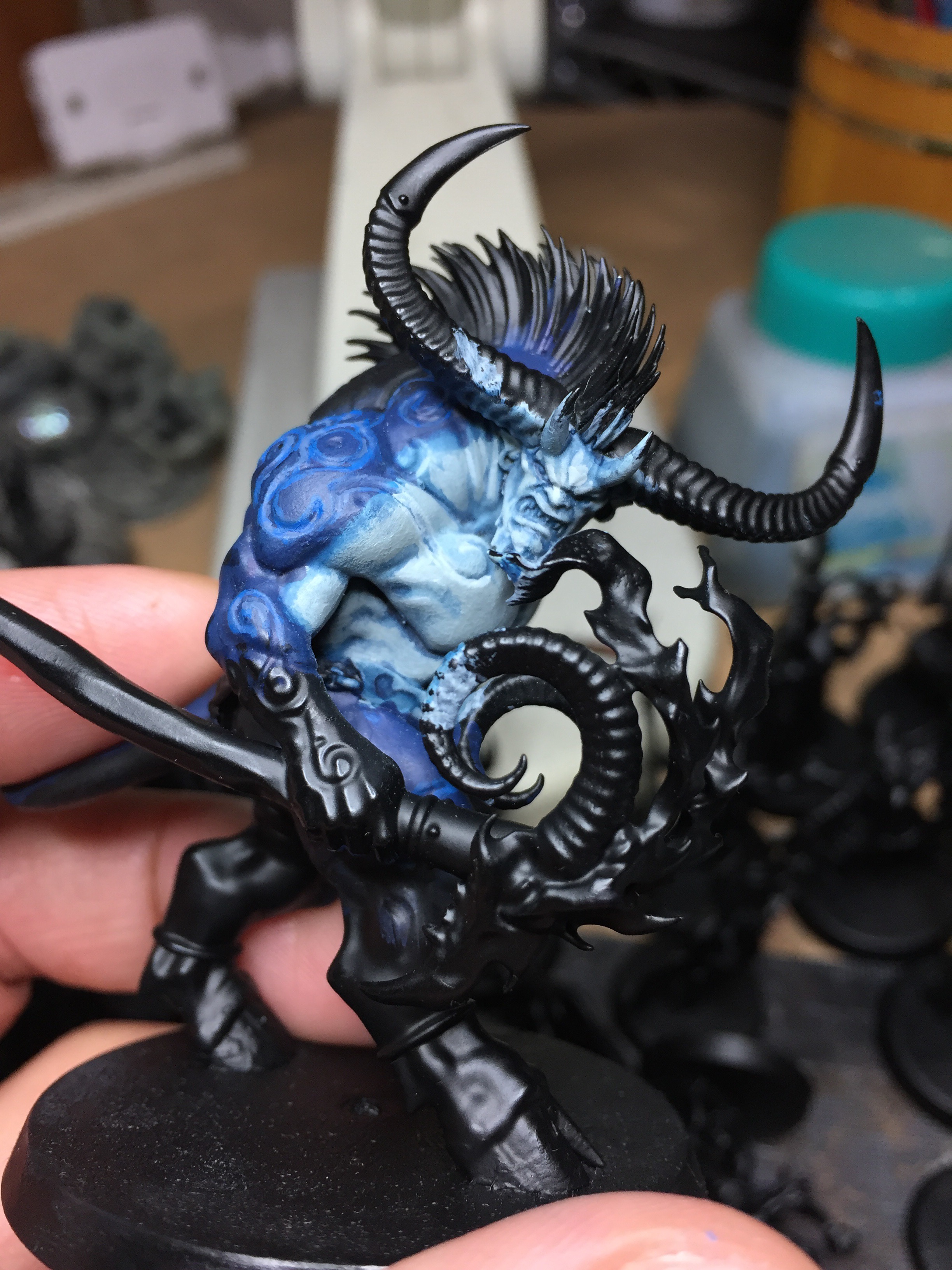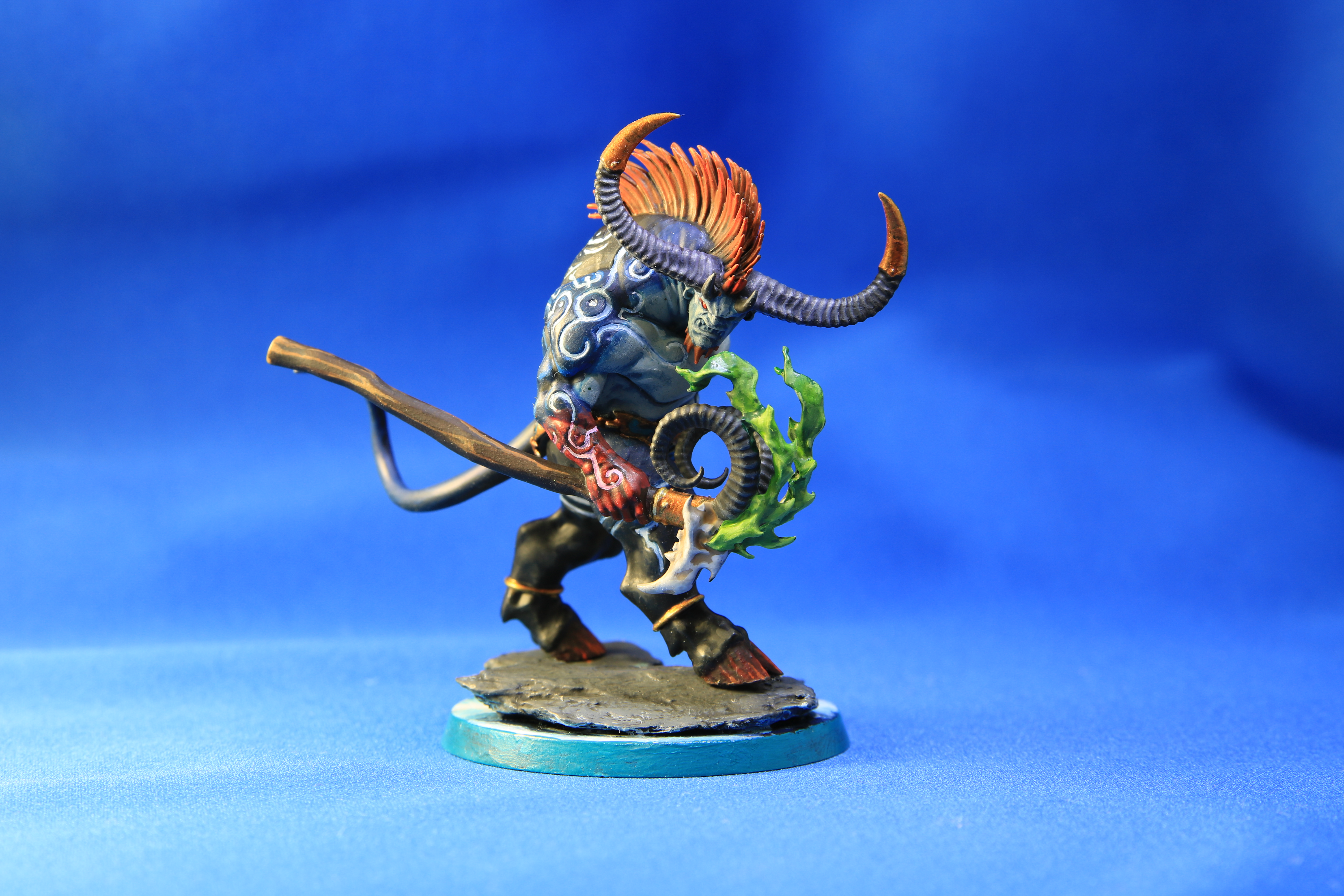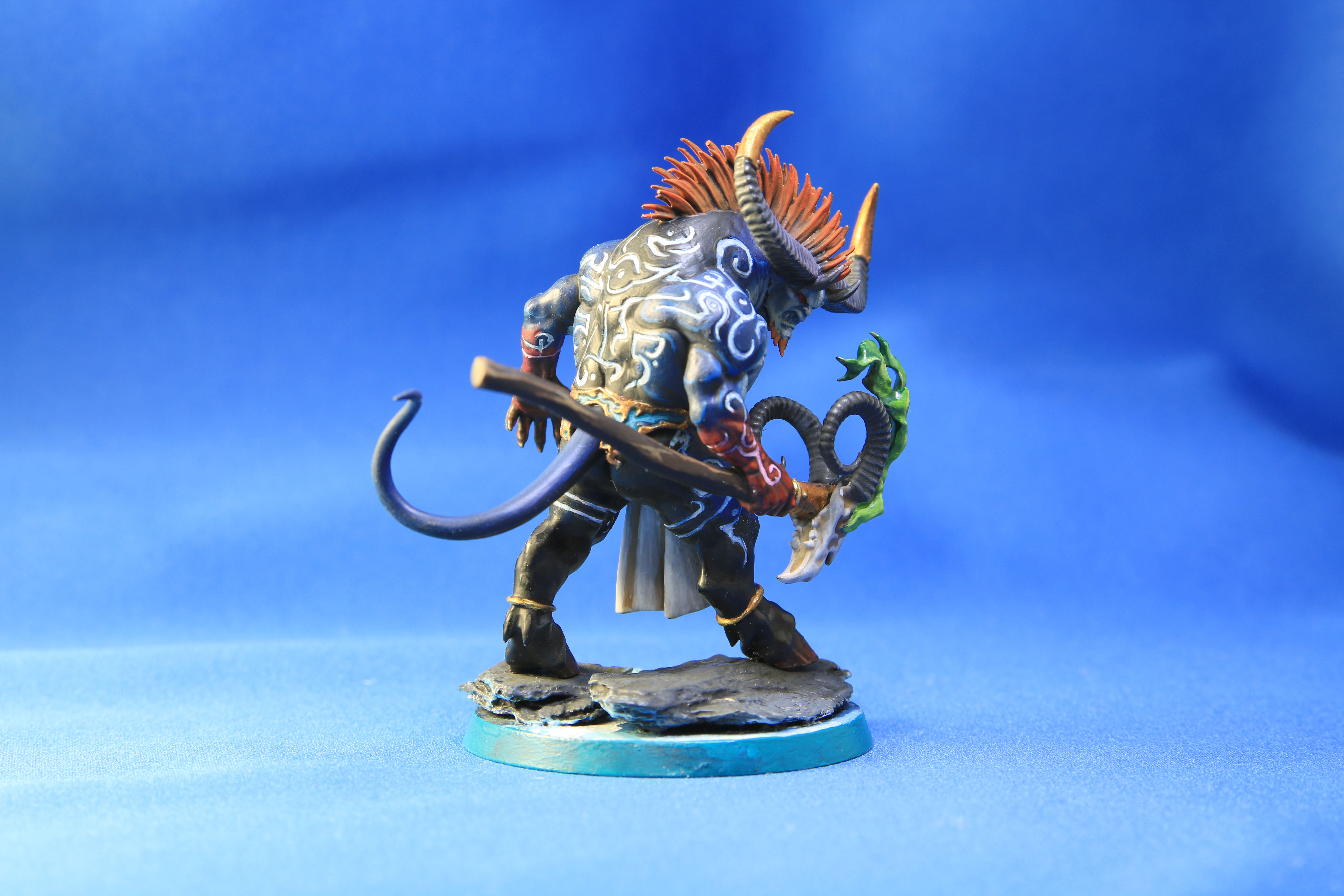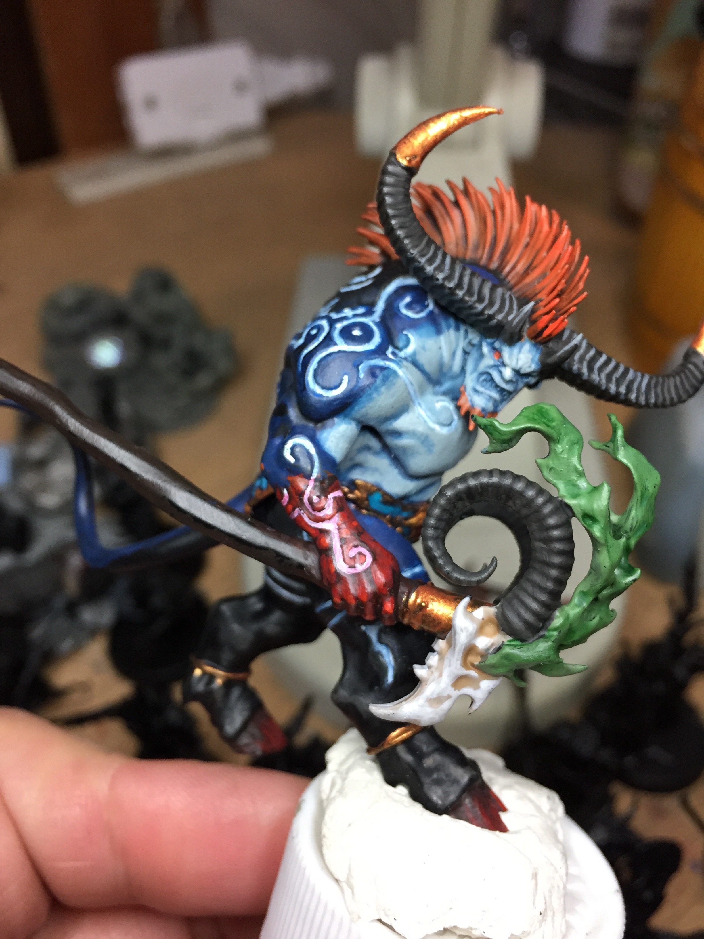 メインとなる青肌を塗り終わったら、腕や鬣などを塗り、体の紋様に色を流し込んで行きます。